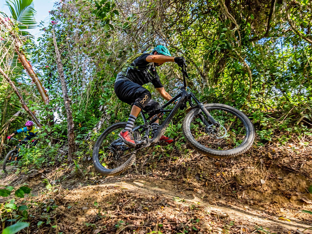 The ride can vary from a 1-hour mellow beginner ride to a 2.5-hour intense XC session. Expect singletrack options with steep uphills and technical descents—plus gorgeous hidden beaches and a true jungle vibe.